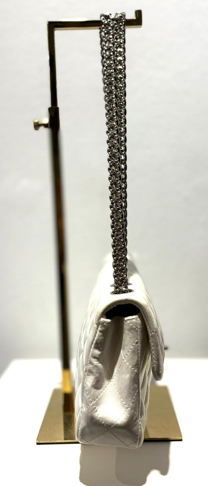 Descrizione: Borsa Chanel East-West Flap in pelle d’agnello trapuntato bianca con metalleria argento , tracolla a catena scorrevole con patta a chiusura girello CC, interno in pelle d’agnello con 3 tasche interne a bustina. Codice seriale presente al suo interno