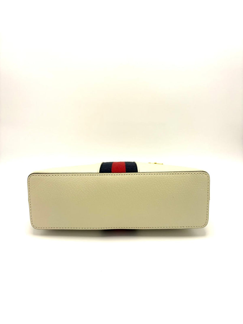 Descrizione: Borsa Gucci Ophidia Dome in pelle martellata bianca con bande in tessuto rosso/blu ,metalleria dorata e comoda tracolla in pelle regolabile, interno scamosciato con comodo taschino e chiusura con zip doppio cursore GG