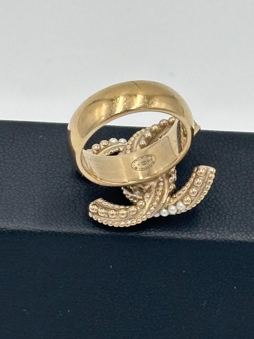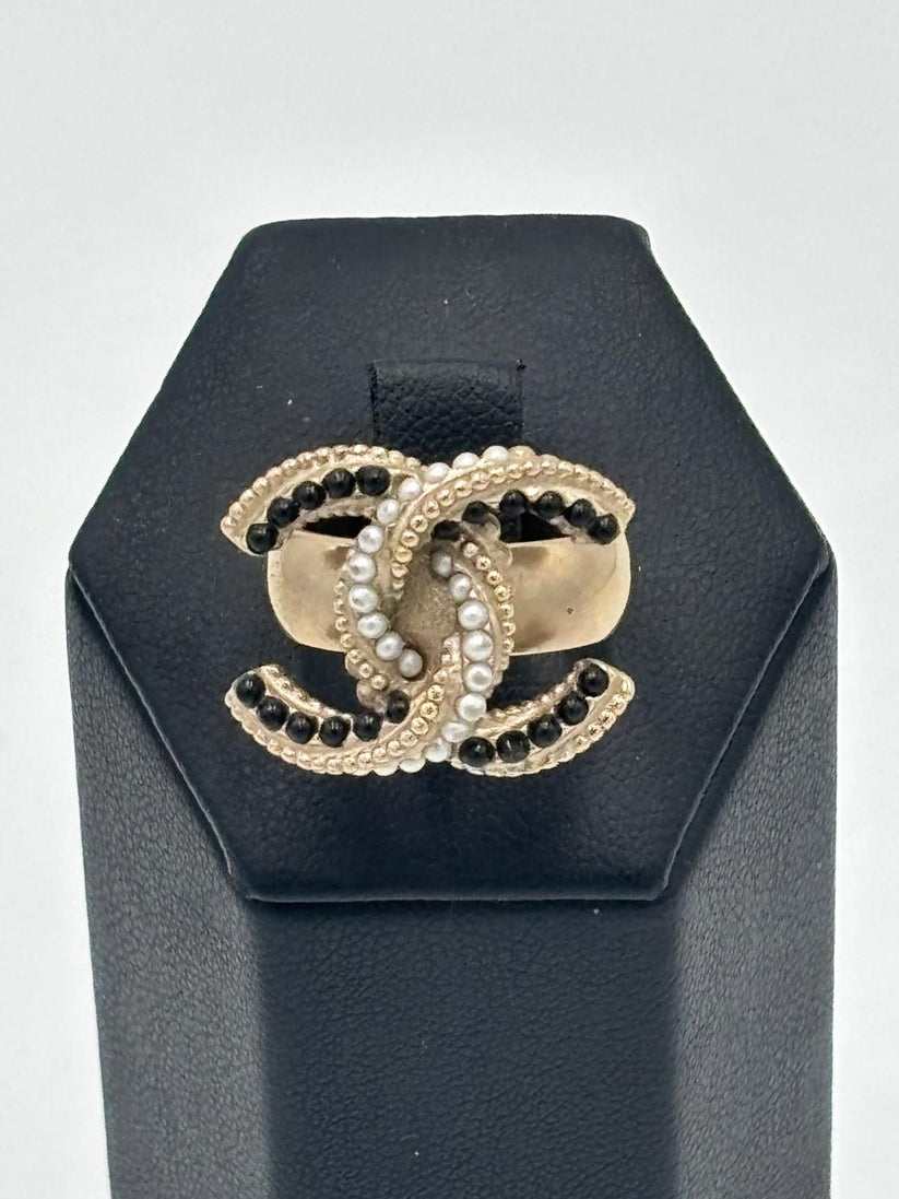 Descrizione: Anello bigiotteria Chanel dorato con CC in perline bianche e nere