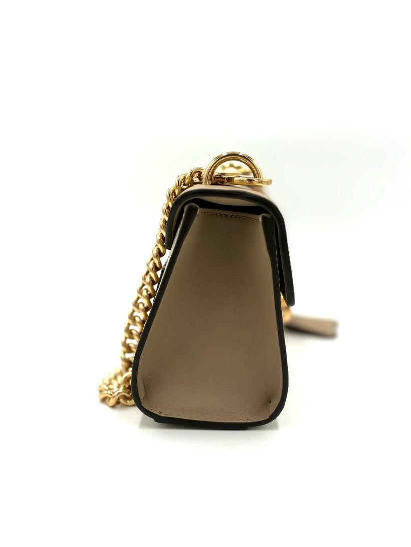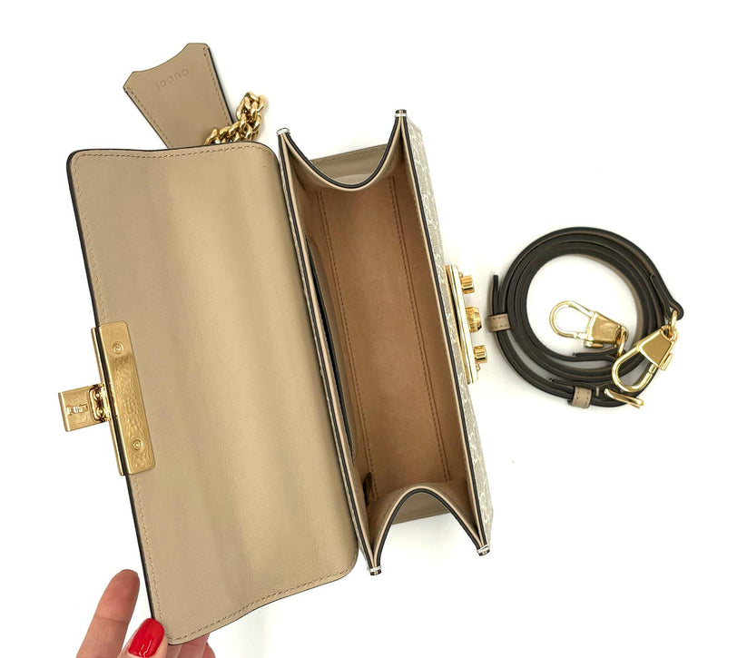 Descrizione: Borsa Gucci Padlock in pelle color beige e canvas GG beige/bianco con tracolla sotto spalla dorata e seconda tracolla crossbody in pelle con chiusura a pulsante dorata