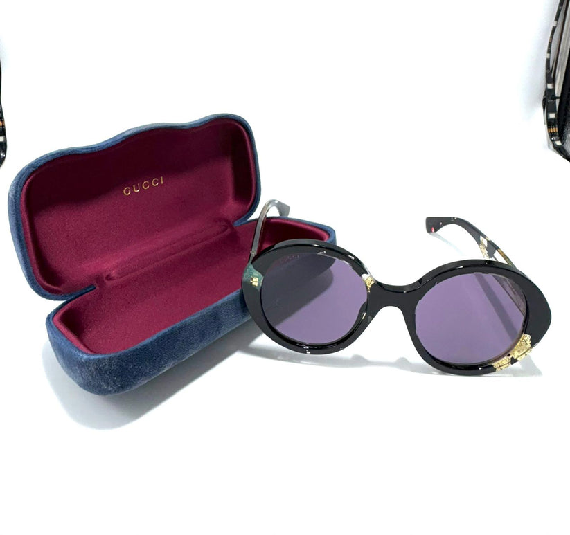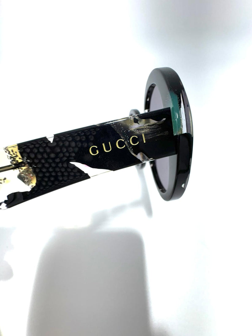 Descrizione: Occhiali da sole Gucci color nero con scritta gucci su stecca colo oro e fantasia colore oro con lente da sole