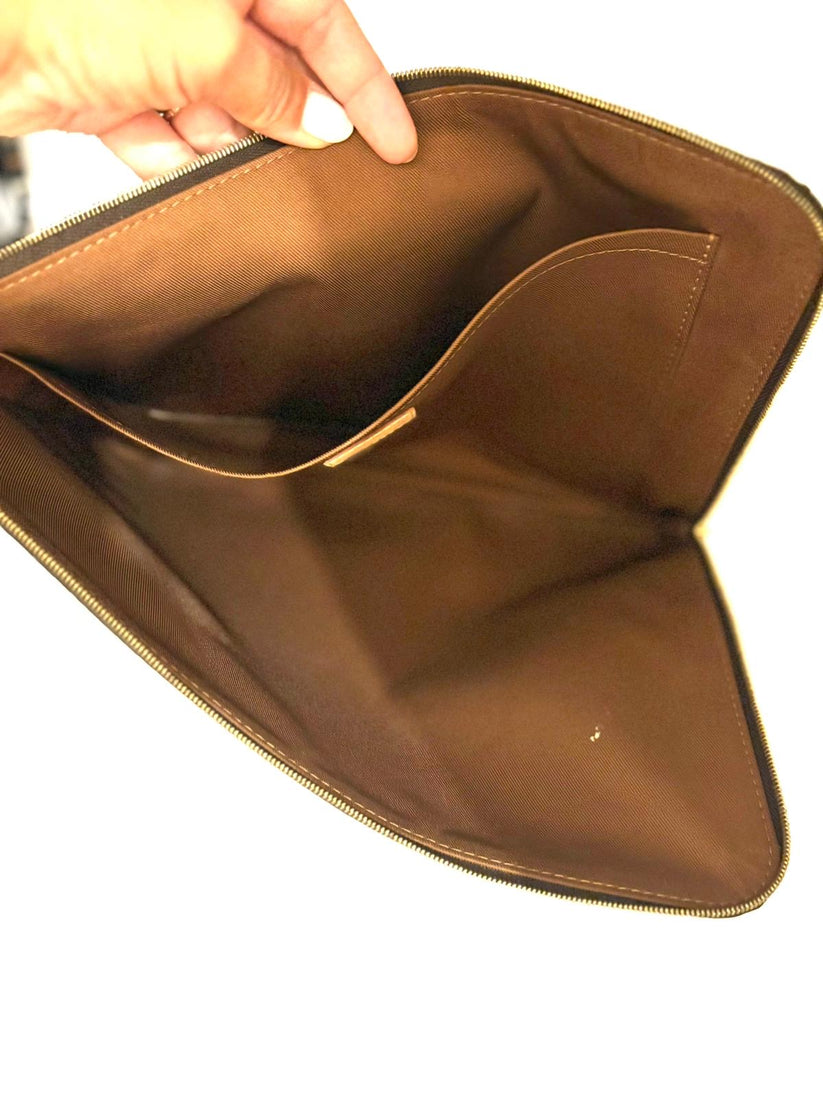 Descrizione: Pochette louis vuitton in tela monogram con finiture in pelle vacchetta, piatta e con chiusura zip nella parte superiore e laterale con tasca interna. Puo’ contenere Tablet o Pc da 13/15 pollici