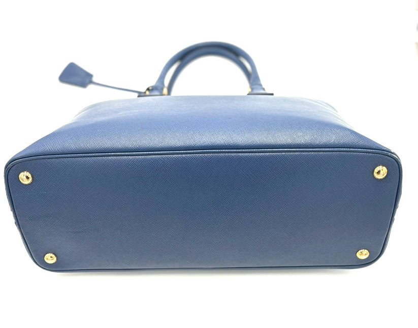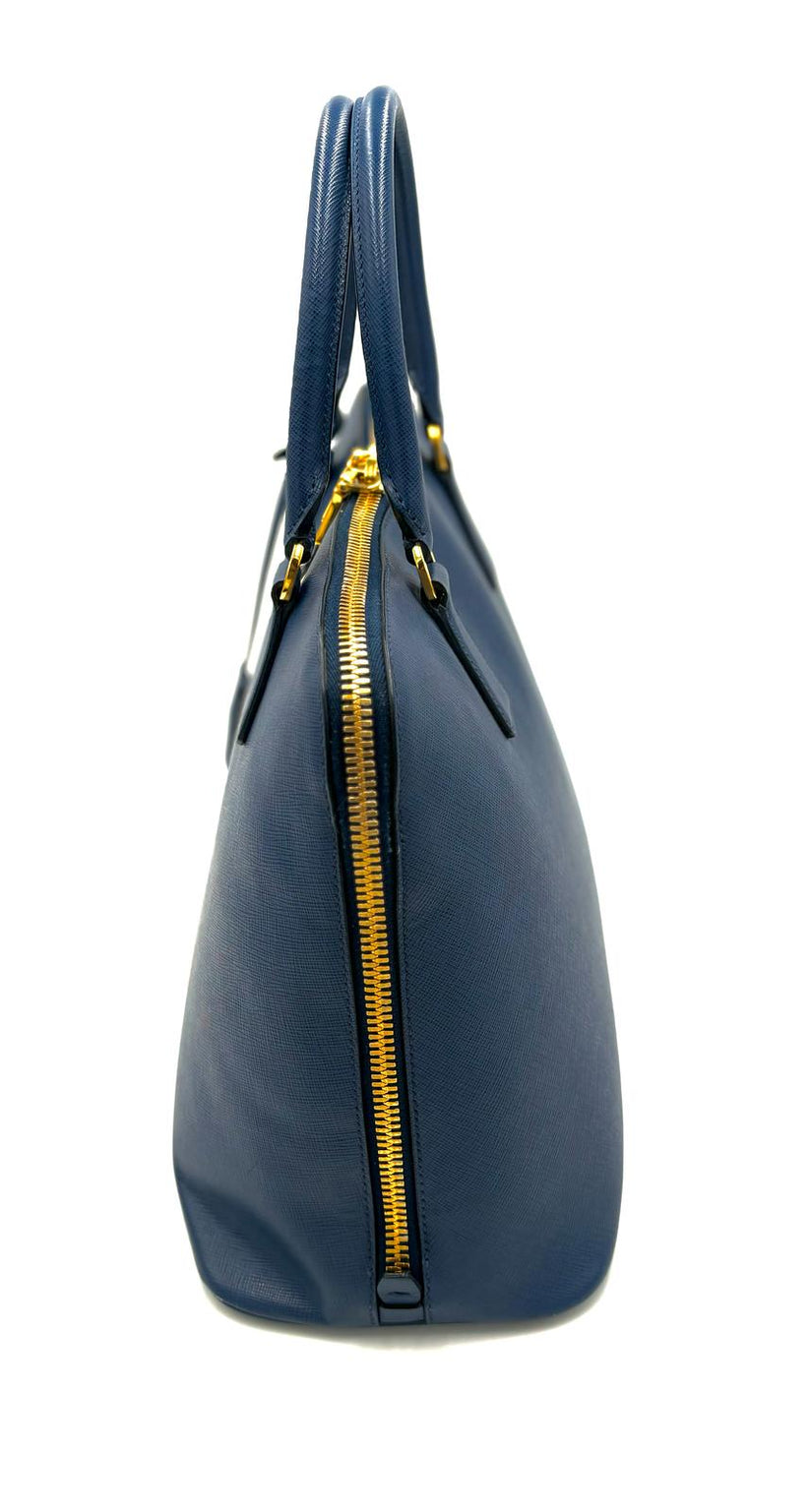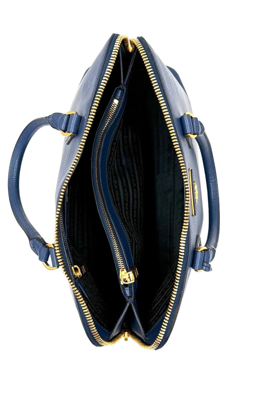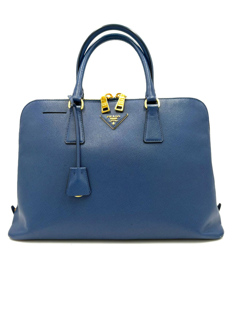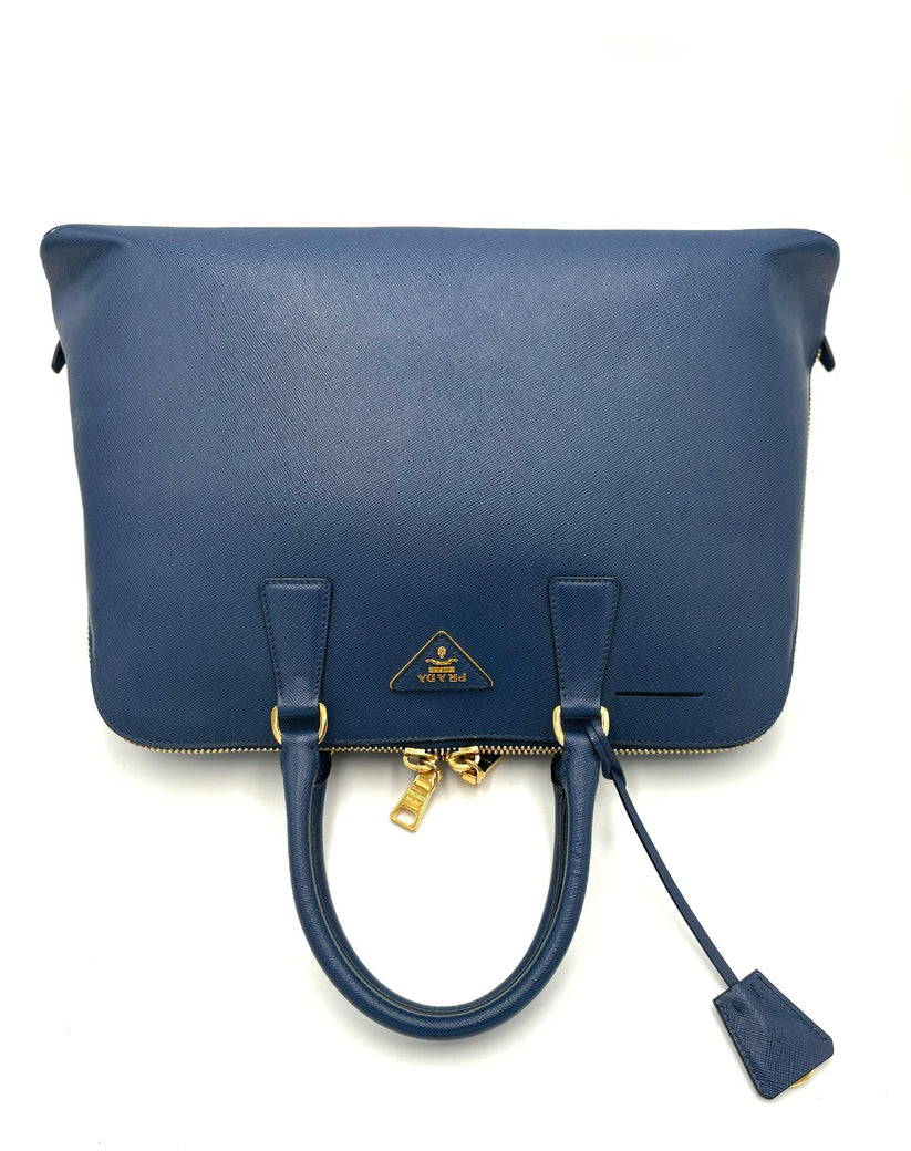 Descrizione: Borsa Prada Hand bag saffiano in pelle blu con metalleria dorata, portachiavi in custodia blu, interno a due scomparti con comode tasche, da portare a mano o sottobraccio , NO tracolla