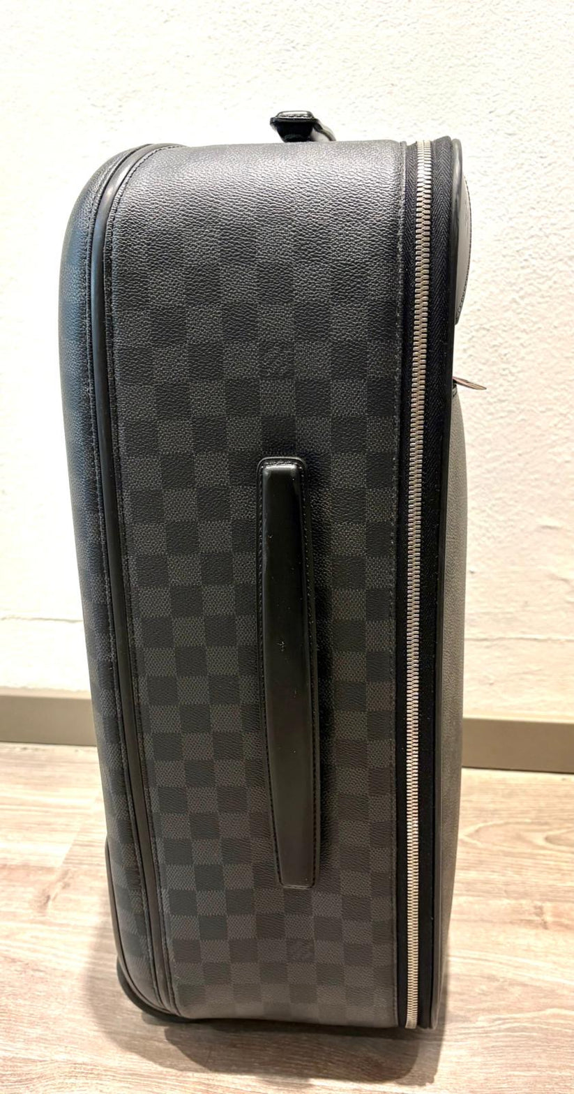 Descrizione: Valigia Louis Vuitton Pegase 55 canvas damier con finiture in pelle nera con interno in tessuto con chiusura a Zip doppio cursore, tascone frontale e carrello estraibile compresa lucchetto e chiave e Dust. Valigia da cabina con carrello appena sostituito in LV con fattura. Pari al nuovo fondo e ruote perfette