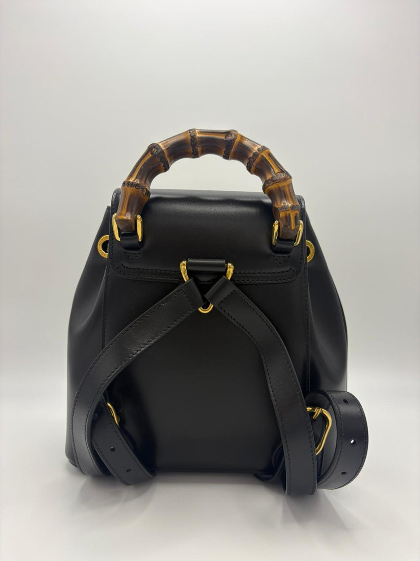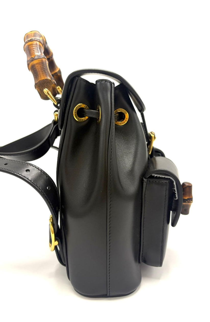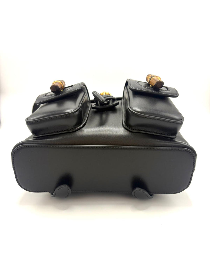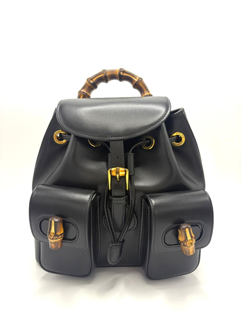 Descrizione: Zaino Gucci Bamboo BackPack in pelle color nero con manico in Bamboo per portarlo a mano e comode bretelle posteriori in pelle nera. Completano lo zaino due tasche esterne con chiusura in Bamboo, chiusura con patta e interno con taschino.